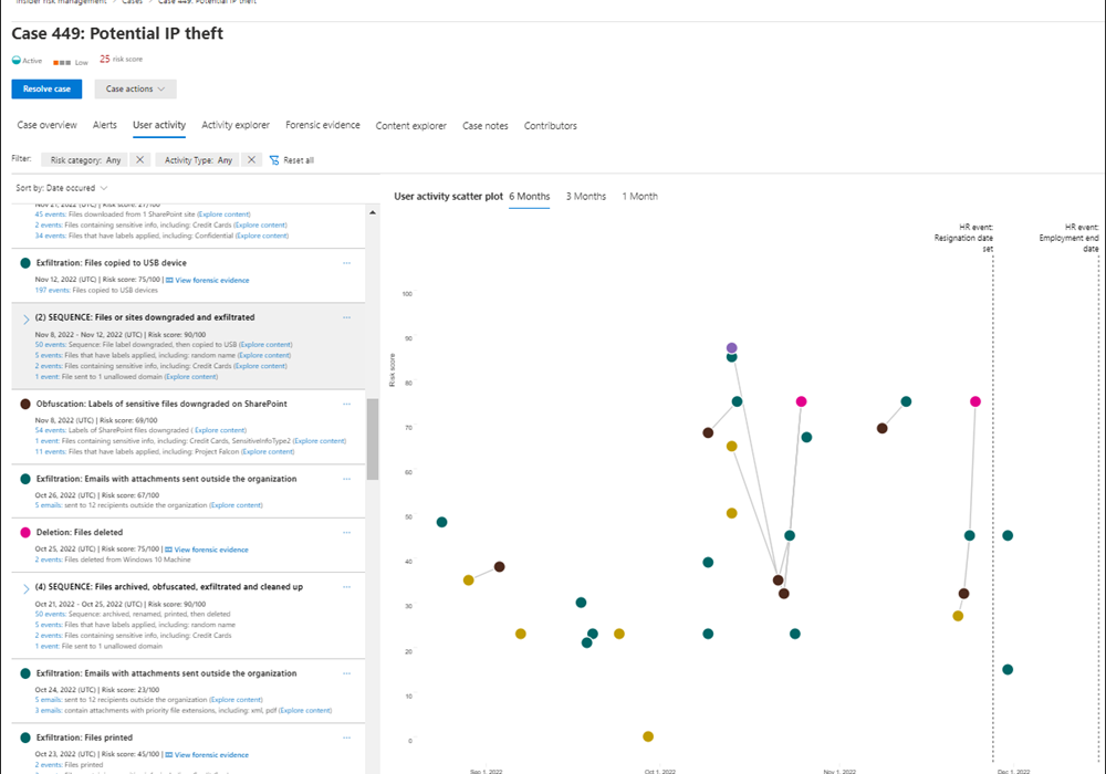 Policy templates make it easy to get started. For example, the **”Data theft by departing users”** template uses signals from an organization’s HR system (via the Microsoft 365 HR connector) to automatically begin monitoring users who have given their notice. The investigation dashboard provides a rich, contextual view of a user’s activities over time, correlating events like file downloads, label downgrades, and emails to external domains with HR events like a resignation announcement. This allows investigators to quickly understand the full story behind an alert.
