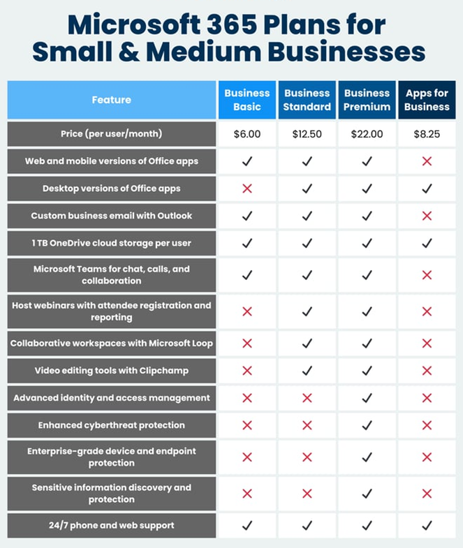 - Microsoft 365 Business Basic: Ideal for small businesses that only require professional email, cloud storage, and basic web/mobile applications.